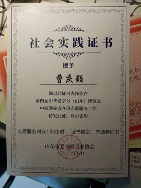 2020年参与中国文化旅游博览会,曹庆颖同学通过自己的努力走入济南、了解济南,尝试扎根济南、服务济南。入校以来,她积极参与社区防控疫情为民服务活动并通过自己专业知识深入企业积极进行关于疫情防控和复工复产的社会实践活动。