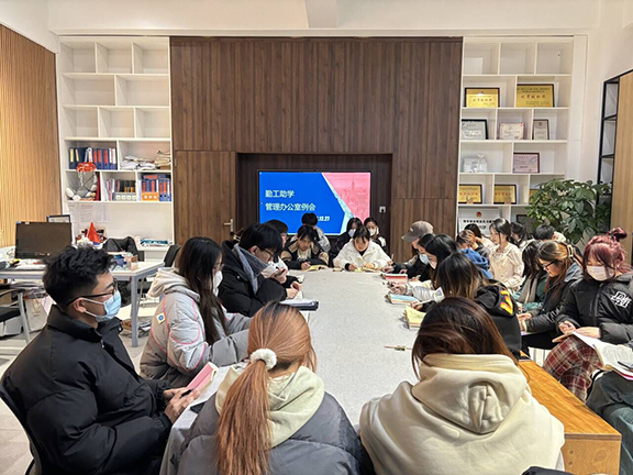 会议伊始,副干事长单彦瞳、陈黄涛,秘书长杨馥铭、解箫宇听取了各小组的工作日程汇报及下周工作计划并对日后勤工助学工作事务进行了规划,在认真听取各组汇报内容后做出了以下要求:一、同学们打扫卫生时尽量不要改变老师文件的位置避免老师无法找到文件;二、请假需先告知本组组长,组长知情后方可请假填表;三、办公室同学需熟悉各位老师及其联系方式,为更好帮助老师以及日后工作效率的提高打下坚实基础;四、说明了1月5日办公室聚餐的相关事宜,各小组分管干事长应做好统计参加人数的工作,为活动的顺利开展夯实基础。