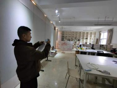 三位老师深入办公楼、一号教学楼和二号教学楼对研究生处所属的共15间教室和工作室进行了摸排。首先,严格落实“制度上墙”措施,在每间教室和工作室张贴安全使用责任书和卫生值日表,并责任到人;其次,对使用违章电器、饲养宠物等其它安全隐患进行了排查;再次,苏浩旭老师就目前研究生教学空间使用现状做了详细地走访调研,以利于下一步研究生教学资源的合理配置。最后,同学们对检查中出现的问题进行了迅速的整改。