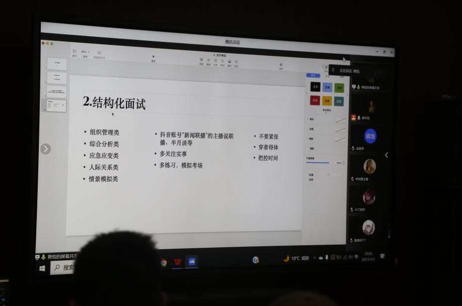 3月1日晚,研究生处邀请2021届毕业生,艺术设计专业学生黄悦,以线上方式给同学们分享了备考公务员和选调生的相关事宜。黄悦现就职于齐河县刘桥镇人民政府。省考笔试已然结束,黄悦有针对性的向大家分享了自己参加面试时的经验,详细分析了结构化面试五大常见题型解题思路,并建议同学们要提高对于面试环节的重视,保持良好心态。提前做好充足准备。