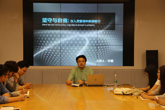 2016年5月11日下午,教研党总支书记孙磊以《坚守与自省——在入党誓词中砥砺前行》为题为研究生党员、全体入党积极分子上党课,党课由研究生二支部书记王伟杰主持。