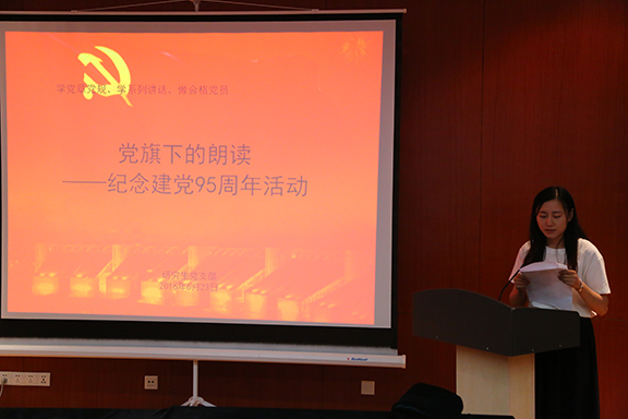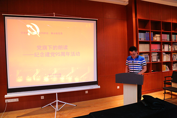 为庆祝中国共产党建党95周年,6月23日下午,研究生党支部在永利官网长清校区研究生学术活动室开展以“党旗下的朗读”为主题的庆祝建党95周年活动。全体研究生党员参加了本次活动。 活动中,研究生党员们围绕主题在庄严的背景音乐中,用饱含深情的文字、真挚朴素的情感朗读了《光的赞歌》、《面对鲜红的党旗》、《党旗飘扬在21世纪的春天》等诗歌散文,讴歌了95年来党的光荣历史,表达了研究生党员热爱党、发扬党的优良传统,继承党的伟大事业的坚强决心。