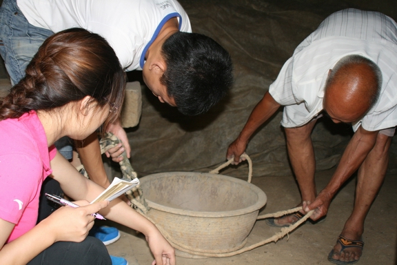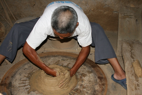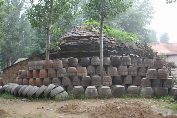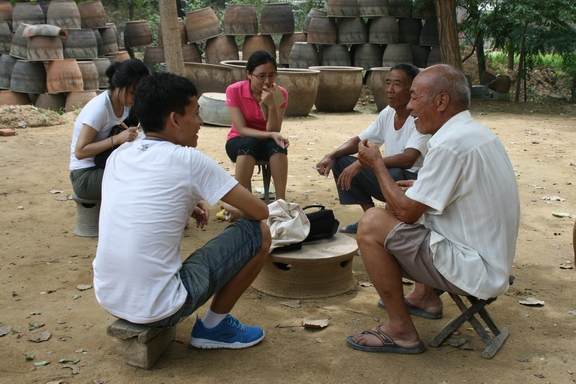 7月29日至30日,考察组首先来到济宁市泗水县柘沟镇七村调研民间制陶缸工艺及发展现状。泗水县陶缸制作历史悠久,根据文物出土最早可追溯到大汶口文化,几千年的发展一直延续至今。考察组重点采访了刘芝廷、刘从水、刘新文三位老人,他们作为村子里制作陶缸的老艺人,对柘沟镇陶缸的历史发展、工艺流程、市场销路等问题有较为深刻的认识和了解。刘芝廷和刘从水老人亲自为考察组做陶缸制作示范,在做缸的过程中,考察组细致询问了柘沟镇陶缸制作的历史发展、工艺流程、产品种类和各种民俗故事、传说等。柘沟镇陶缸根据尺寸大小分为“花腰”、“吃五缸”、“吃三缸”、“吃一缸”,除陶缸外根据生活需要还有“懒起”、“气死猫”、“凳”、“桌”等生活用品。在谈到发展现状时老人们不时的产生担忧,由于市场需求严重缩水,制缸已不能满足人们的生活需求,许多手艺人都转行改业谋生,现在的年轻人不愿从事这一行业,因此这项民间手工艺面临失传和灭绝的尴尬境地。对于这一全国性、紧迫性、严重性的民艺发展问题,需要汲取全社会的力量对我国手工艺的发展做出努力。