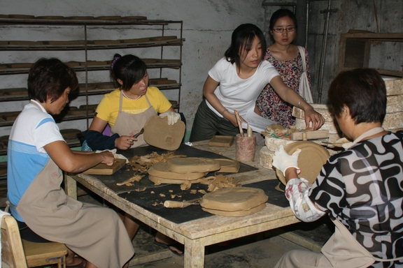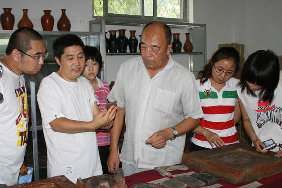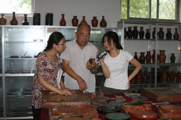 7月31日至8月1日,考察组来到泗水县鲁柘砚工艺研究所对鲁柘澄泥砚进行了深入、细致的调研。鲁柘澄泥砚,又名鲁柘砚、柘沟陶砚、澄泥砚,产于有五千多年历史的制陶古镇泗水县柘沟镇,始于唐、盛于北宋,曾被誉为中国四大名砚之一,在国内外享有极高盛誉。鲁柘砚已失传八百余年。1990年,在著名专家教授具体指导下,经精心研制使之重现光华,目前已生产十多个花色,五百多个品种,其形制既传统又创新,具有温润如玉、含津益墨、声若金石、手触生晕、哈气可研、发墨如油、不渍水、不损笔等特点,其质地、造型、色泽、实用等方面,均大大超过宋代所制,是继承发扬民族传统文化、古为今用的范例。鲁柘砚工艺研究所所长、著名书法家杨玉祯先生亲自带领考察组观看了砚台制作的整个工艺流程,从泥料的取材、澄泥、翻模、雕刻、入窑、包装等全过程进行了细致、耐心的讲述,考察组做了细致的记录,并对制砚工人进行采访,力求对鲁柘砚的调研更加完善。在鲁柘砚工艺研究所收藏室内,杨玉祯先生将研究所内珍藏的古砚、“茶叶末”、“鳝鱼黄”等精品砚、大型砚台以及各种现代创新砚、新产品一一展示,并与考察组成员进行了良好的专业沟通。通过对众多鲁柘砚的实地观察和亲身体验,考察组对鲁柘砚的发展历史、工艺特点、艺术特色等有了更加直观和深入的认识。考察组还就鲁柘砚制作行业现在所面临的问题进行了探讨,了解到市场开拓面狭窄和专业设计人才的不足是当前鲁柘砚行业所面临的最大问题,希望有关单位能够积极提供一些帮助,也希望有兴趣的学生能更多地投身到鲁柘砚行业,为鲁柘砚制作工艺的传承和发展做出应有的贡献。