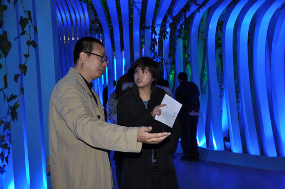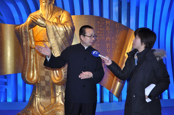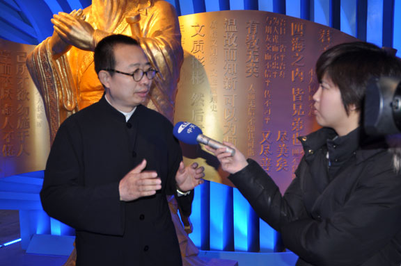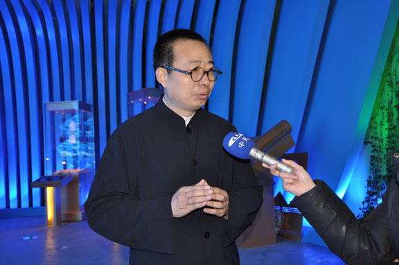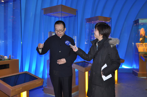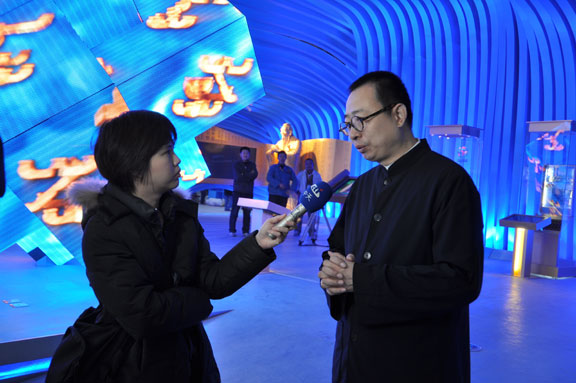 4月12日上午,在调试完毕、具备正式运营条件的山东馆内,山东省上海世博会参展工作领导小组执委会副主任、山东省文联主席、世博会山东馆艺术总监、304am永利集团官网院长潘鲁生,应邀接受了台湾中天电视台记者的采访。 潘鲁生院长在接受采访中谈到,世博会山东馆的主题是“齐鲁青未了”, 山东馆以现代雕塑艺术语言,蓝色的曲线造型,表现了“海岱交融”的主题意境。通过“城市智慧”、“城市家园”、“城市畅想”三个展厅,回答了“智慧的、创造的、文明的、和谐的城市让生活更美好”的文化主题和山东理念。 在山东馆内,潘鲁生院长详细解说山东馆的序厅、主展厅和尾厅设计方案、展品展项、互动展示等内容,并着重介绍山东馆亮点:鲁班锁、孔子像、花如意。山东馆以“鲁班锁的营造智慧开启美好家园”开始,以“孔子厚德仁爱的文化胸怀铸造城市灵魂”提升展示内涵,以“花如意的和谐理念畅想美好生活”收尾,表达了山东城市发展的自信和未来城市发展的伟大畅想。 最后,潘鲁生院长在采访中指出,304am永利集团官网作为世博会山东馆主题策划、主题演绎、展示设计、施工布展单位,积极实践教学型设计艺术大学的办学理念,山东馆还有很多精彩的设计和实施是永利官网学生的创意。世博会山东馆为学生提供了丰富的实践和锻炼平台。 永利官网世博会山东馆项目部副总指挥毕剑翎、韩文涛,设计组组长王延羽,工程组组长张震,文案与展品展项组组长孙磊,王启健、王瑞奇、林宇峰、郑靖等一同参加活动。