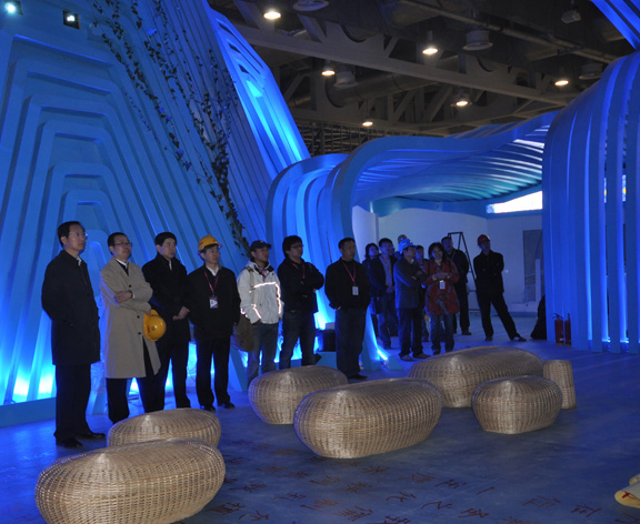 院长的陪同下,费云良主任、韩金峰秘书长领导一行在山东馆主展厅现实影院环境下观看了世博会山东馆三部电影,并查看主展厅观影藤编座具,主展厅地面字体装饰,对影院整体效果表示满意。