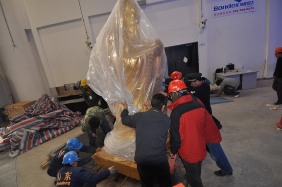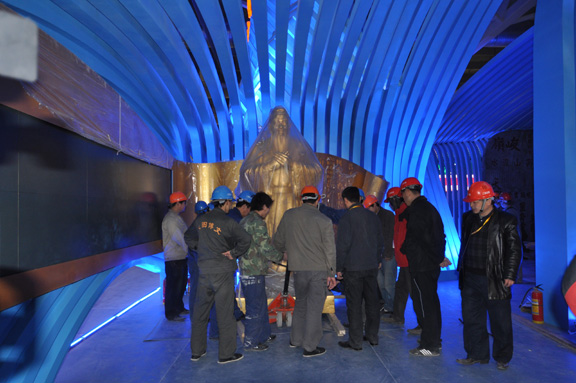 上午午时,世博会山东馆标志性展项—孔子像在序厅最终定位,这标志着山东馆内部展品展项工作胜利结束。山东电视台总编辑祝丽华、导演杨枫陪同审查。