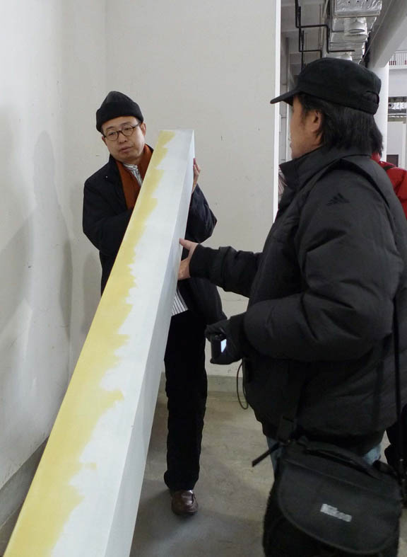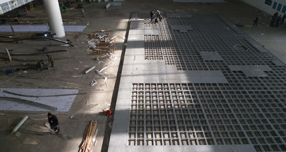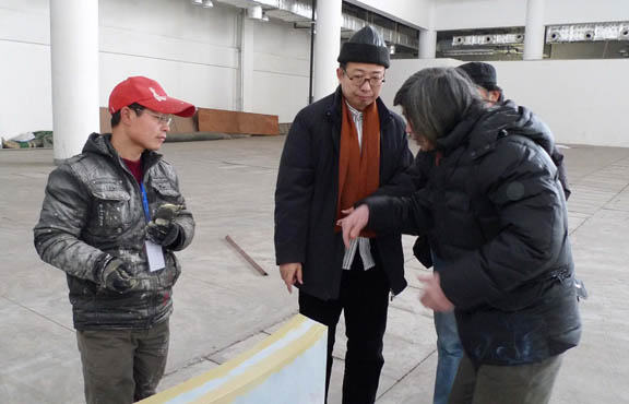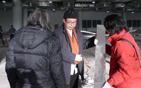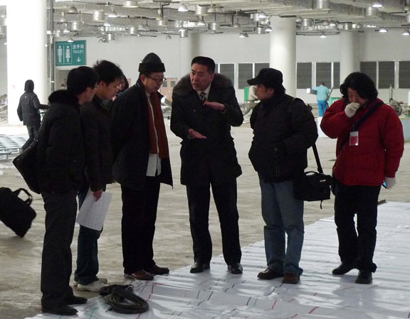 院长召开了现场工作协调会。潘院长首先代表学校对各单位的辛勤工作表示感谢,并指出:一,省委省政府高度重视世博会山东馆的建设情况,1月15日在济搭建完成是一项必须保质保量完成的重要的政治任务;二,山东馆的外形艺术效果独特,要在设计的基础上,以雕塑的精细度在实施过程中以一贯之;三,地台铺设、综合布线、照明效果、框架制作、施工监理等各个部分,要合理配合;四,框架结构、强弱电线路等工作,要以安全为第一要务。