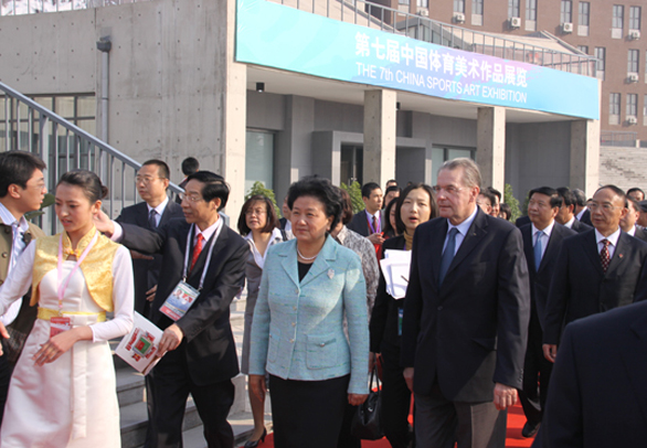 在第十一届全国运动会即将开幕之际,10月16日上午,中共中央政治局委员、国务委员刘延东在永利官网长清校区会见了国际奥委会主席雅克•罗格一行,一起参加第七届中国体育美术作品展览开幕式并参观展览。 国家体育总局局长刘鹏,教育部部长周济,国务院政策研究室副主任江小娟,国家体育总局副局长于再清、冯建中,中国文联副主席、中国美协主席刘大为,国际奥委会委员、中国香港奥委会主席霍震霆,山东省省委副书记、省长姜大明,山东省省委常委、宣传部长李群,山东省副省长黄胜、李兆前等中央国家机关和山东省领导陪同。
