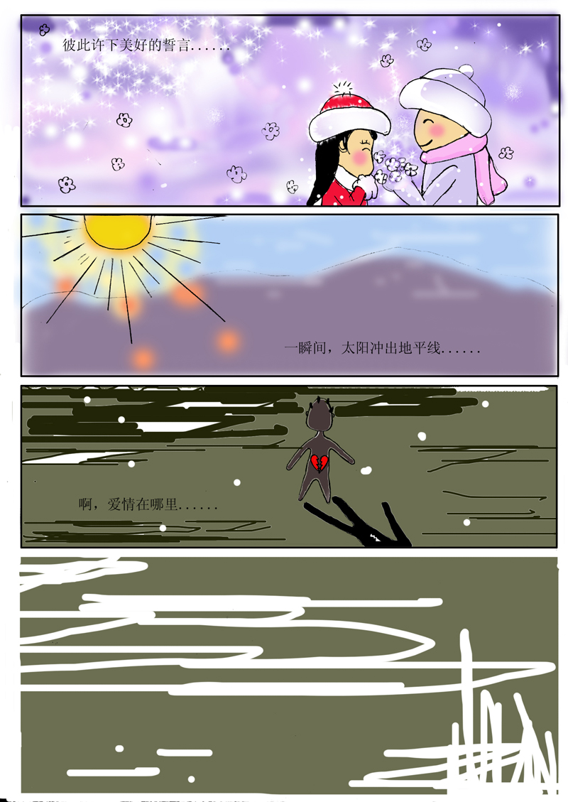 殷:主要表达“爱情来的快,结束的也快”。虽然我没有经历过爱情,平时只是看漫画、小说等所感受的。我认为若是两个人在一起,就应该相互了解,相互信任,不能欺骗对方。在创作的时候,时间有点仓促,思考得也不是很完善,但在创作过程中不断丰富内容,不断充实想法,最后就是现在看到的作品了。