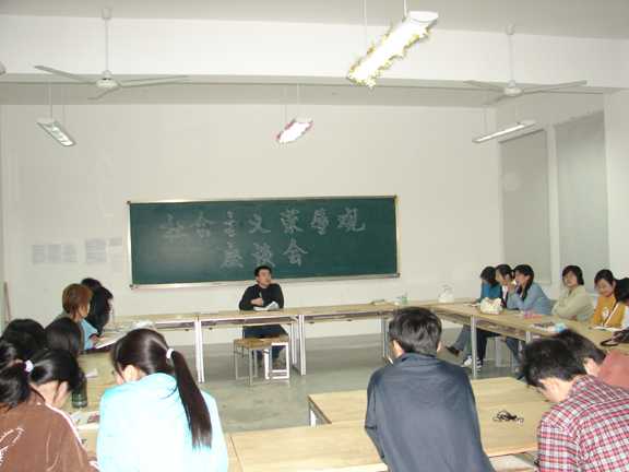 为牢固树立社会主义荣辱观, 2006年4月15日下午18:00,人文艺术学院在长清校区教学楼04级设计学班召开了“树立社会主义荣辱观”学生座谈会。辅导员解恒岩老师、30多名学生代表会聚一堂,就树立社会主义荣辱观、大学生责任和使命等方面进行了深入交流。会议由人文艺术学院长清校区学生会主席巴璐玮主持。