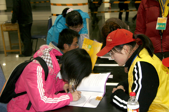 在报名区入口处,志愿者组的李志强正带领干事们忙碌着,一方面组织考生排队,一方面查看考生的报名表。该组宋华荣同学在接受采访时深有感触地说:“考生十分不易,一个月的时间内奔波于几个城市之间,参加数场考试,只为圆自己的大学梦。我也是过来人,曾得到过我院服务生的帮助,体会到那种被人关心的温暖。更何况在几个月后,前来报名的考生很有可能成为我的校友,所以我想尽我所能把这种温暖传递下去,多呵护他们一些,让他们在求学路上走得更加顺利。”