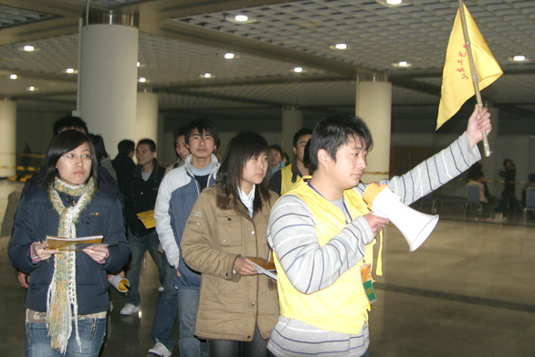 点名组负责人张冰向记者详细介绍了志愿者组的情况。她谈到:志愿者组的同学分布在会展中心大厅的一、二层,主要是接洽引导组同学的工作,将考生从自由区带入点名区等候报名。为了不滞留考生,他们还在相应的收款、报名处设置了隔离带,使考生能够快速地完成报名。