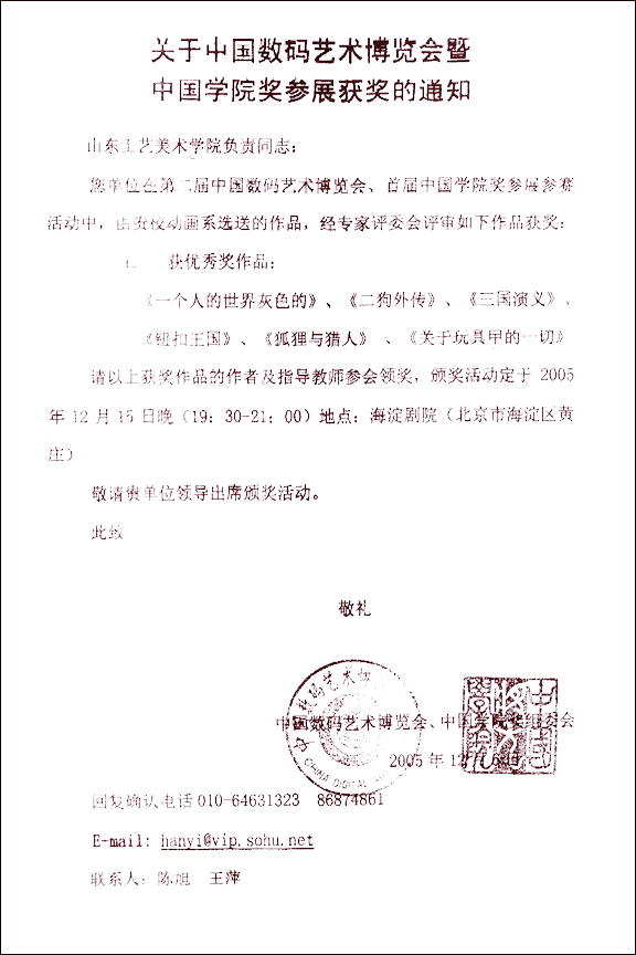 在第二届中国数码艺术博览会、首届中国学院奖参展参赛活动中,我院数字艺术系动画教研室报送的作品更是大展风采,有多件学生作品荣获优秀奖。分别是:《一个人的世界灰色的》、《二狗外传》、《三国演义》、《钮扣王国》、《狐狸与猎人》、《关于玩具甲的一切》。