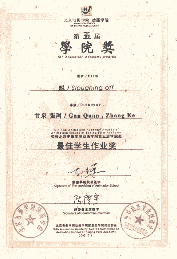 2005年,可谓我院动画专业的丰收年。近日,获奖喜讯接连传来。由我院数字艺术系05届动画专业毕业生甘泉、张珂携手创作的动画短片《蜕》,在中华民族文化促进会动画艺术专业委员会、北京电影学院动画学院联合举办的动漫作品大赛中,荣获北京电影学院动画学院第五届学院奖最佳学生作业奖。