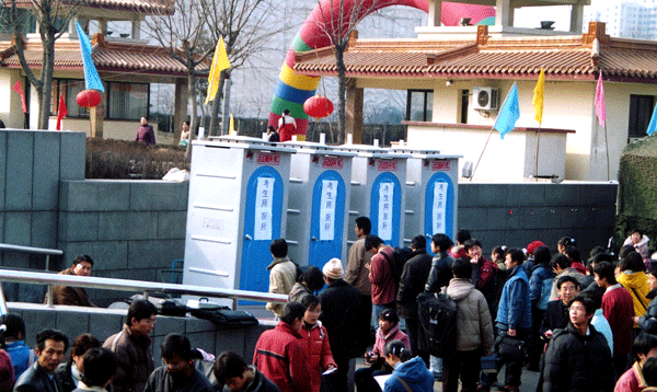 这是怎么一回事呢?为此,记者找到了学院相关负责人总务处处长张洪军。据他介绍,由于今年考生人数多,考虑到会场内厕所数量不够用,为方便考生,学院今年共租用了六个活动公厕。在考生密集处,会场外红拱门的右下方设有四个,在会场出口处也设了两个活动公厕,供结束考试的考生及等待考生的家长使用。学院每天还定点对公厕进行清洁,以保持长久的卫生。