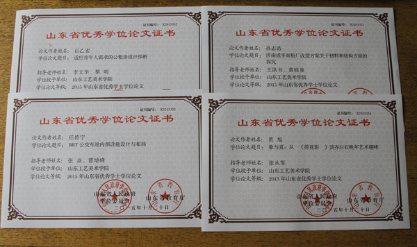 近日,接山东省人民政府和山东省教育厅通知,永利官网有四篇学士学位论文获2015年山东省优秀学士学位论文称号,他们是:孙志浩同学的《济南成丰面粉厂改造方案——关于材料和结构方面的探究》,指导老师:王洪书、黄晓曼;石乙宏同学的《适应青年人需求的公租房设计探析》,指导老师:李文华、黎明;任传宁同学的《BRT公交车站内部设施设计与布局》,指导老师:张焱、曹培峰;贾旭同学的《象与真:从〈荷花影〉谈齐白石晚年艺术趣味》,指导老师:张从军。