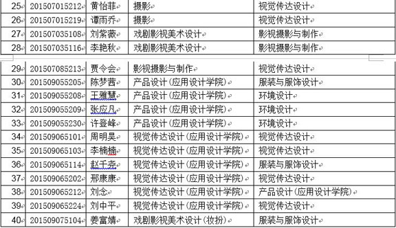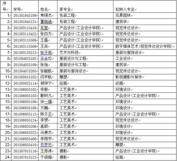 根据《304am永利集团官网关于全日制本科生转专业的办法》(鲁工美院办字【2014】22号文)规定,学校组织了2015级本科56名学生转专业报名和考试工作。根据转专业规定中使用的录取办法和考试结果,拟同意常瑛杰等40名同学转入申请专业学习。为保证转专业工作的公开、公平、公正性,现将结果公示如下: