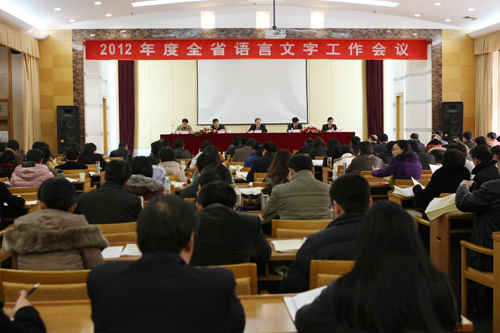 郭建磊副厅长回顾总结了2011年语言文字工作进展情况和取得的成绩,分析了当前工作面临的新形势新问题。针对高校语言文字工作,他指出,要不断强化学校语言文字工作的基础地位,加强分类指导,有针对性地加强学校语言文字规范化建设;要继续抓好学校语言文字规范化示范校评选工作并实行动态管理,力争在2015年之前,实现普通话成为校园语言的目标,达到语言文字规范化的基本要求;高等学校要把语言文字工作贯穿于教书育人的全过程,落实到科学研究、服务社会、传承文化等各个领域。当前和今后一个阶段,必须突出抓好高校的普通话培训测试工作,加强对高校普通话测试站的评估检查工作。