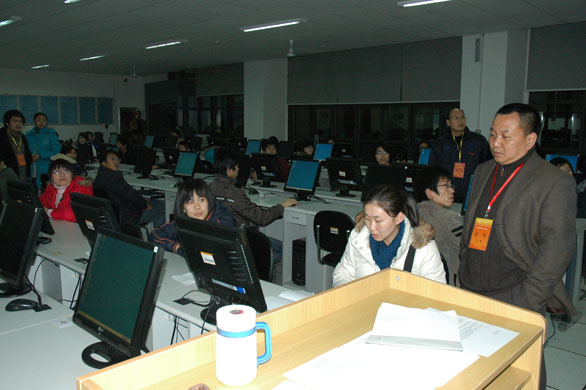 评估专家组成员、中央美术学院设计学院副院长许平教授主持了计算机技能测试,许平教授进入考场后首先询问了计算机网络连接情况和试题内容,并认真检查考题。计算机技能测试内容主要是Powerpoint演示文稿操作和互联网基础知识,侧重于考查学生动手操作能力。许平教授表示,这次测试题目操作性强,能够检验出学生对计算机的使用能力。