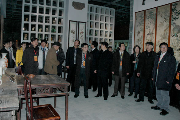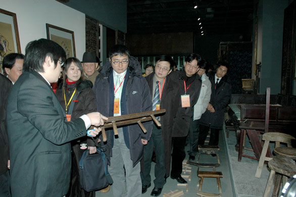 院长介绍说,本馆收藏的民间艺术品能够为学生提供丰富的实物教学资源,让学生感受到深厚的传统文化精髓,并将传统文化元素融入到现代设计理念中。应用设计学院家具设计专业的学生正在馆内考察传统家具构造,领导、专家看到学生们认真地观察、记录,频频点头。刺绣馆展品涉及山东、陕西、山西、湖北、贵州、云南、四川等12个省区的四百余件民间刺绣,也为学生学习中国传统民间造型、民间图案、民间工艺、民间色彩,了解其中蕴含的深厚的传统文化精神提供了重要的实物资料。这些题材丰富、工艺精湛的展出物品,使专家们不禁驻足欣赏,连连称赞。教育部评估专家组长杨永善教授被精细的刺绣作品所吸引,他说:“刺绣作品非常精美。”