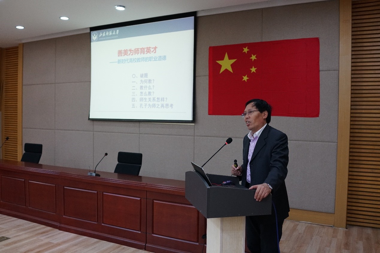 8日上午,山东师范大学任者春教授为参训教师做了题为《善美为师育英才—新时代高校教师的职业道德》专题报告。报告以孔子为师为主线,从为何教、教什么、怎么教、师生关系和孔子为师再思考五个方面深入浅出的阐述了当代高校教师的职业道德标准,为青年教师尽快进入角色和找准自身定位指出了方向。