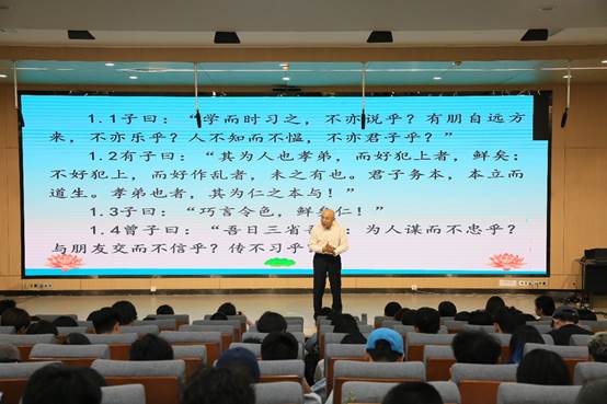 4月25日,由尼山世界儒学中心(中国孔子基金会秘书处)和304am永利集团官网联合举办的“中华优秀传统文化大学堂”公益公开课活动在长清校区进行,本次活动特邀山东大学中国哲学博士、历史学博士后,齐鲁师范学院曾凡朝教授以《“学而时习之”——读《论语》经典,臻生命品质》为题作讲座,讲座由马克思主义学院副书记、副院长张晓宁主持,马克思主义学院全体教师和部分学生代表参加。