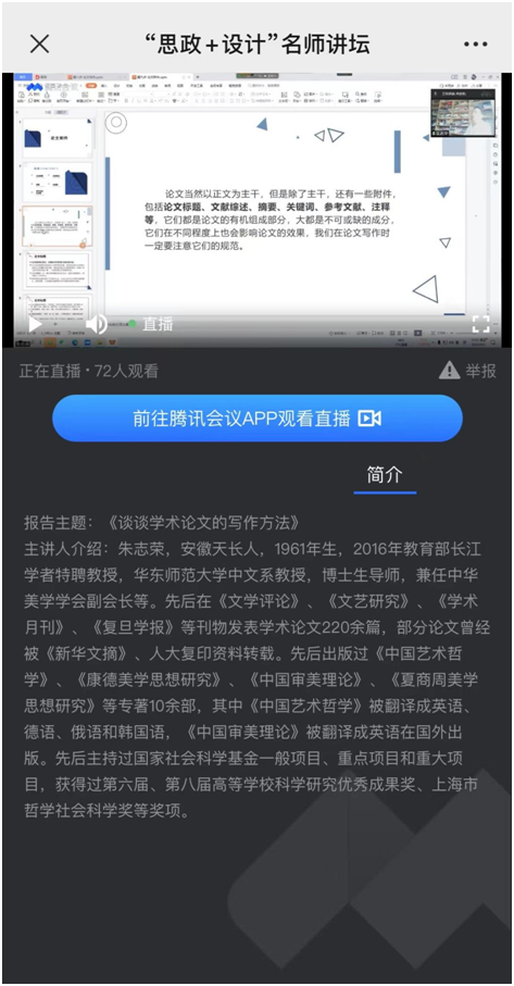 6月3日下午,学校党委宣传部、马克思主义学院共同主办了“思政+设计”名师讲坛活动。教育部“长江学者”特聘教授,华东师范大学中文系教授、博士生导师,中华美学学会副会长朱志荣应邀作为主讲人作主题报告。讲座由学校党委委员、党委宣传部部长、马克思主义学院院长韩文涛主持。马克思主义学院副书记、副院长张晓宁及马院全体教师、学校部分专业师生、其他高校多名师生于线上、线下共同参加。