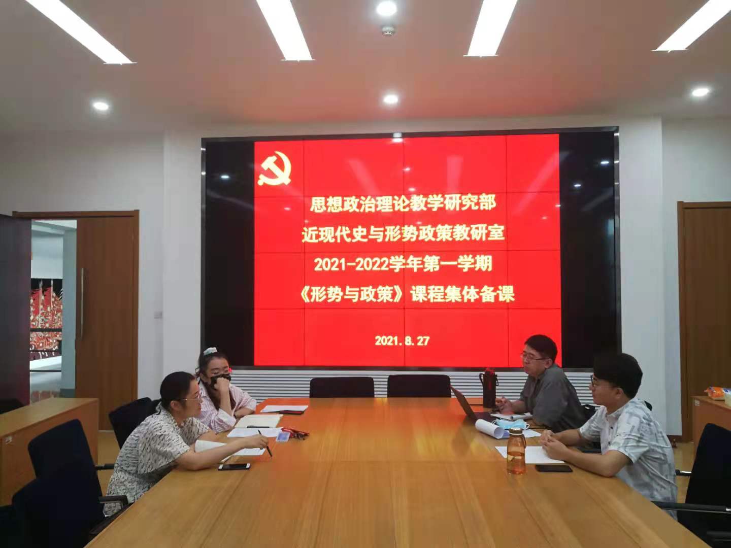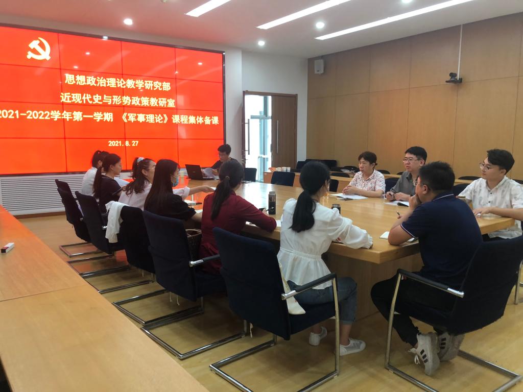 为落实集体备课制度,进一步为即将开始的秋季学期教学作准备,2021年8月27日下午,中国史形势政策教研室组织开展了《军事理论》、《形势与政策》两门课程集体备课。活动由教研室主任金文涛主持,全体任课教师参加。