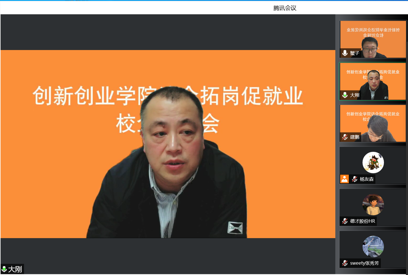 为积极响应和落实“访企拓岗促就业”专项行动,拓宽就业渠道,破解学生就业难题,5月11日晚,创新创业学院组织“访企拓岗促就业”校企对接会议。校党委委员、统战部部长孙大刚出席会议,创新创业学院党总支副书记解恒岩主持会议。