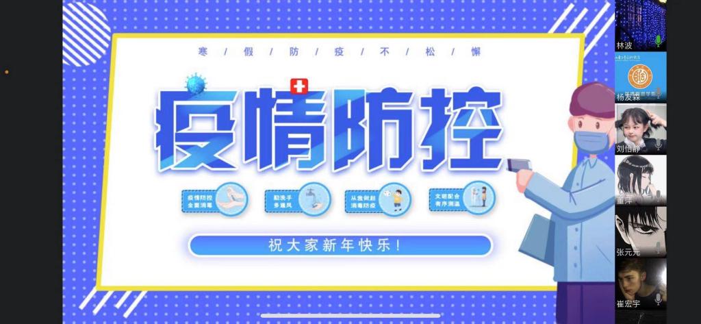 学生会副主席李一凡从“近日最新疫况”、“寒假居家疫情防控生活注意事项”及“疫情中常见心理问题及其应对”三个方面向同学们进行了简要介绍。期间,同学们也积极踊跃的就本地的疫情防控形势、疫情防控措施、疫情防控要求以及自己在疫情防控中做了哪些个人防护进行了交流。从同学们的交流中,可以看出同学们对疫情防控的形势及政策了解的比较到位,有较为清晰的认知和判断。