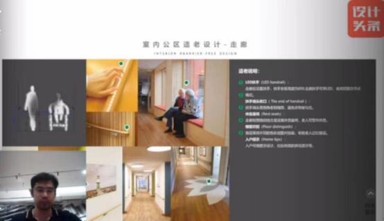 王晨老师以“适老空间设计”为主题,对适老的设计理念与设计思路进行了细致而深入的剖析。他讲解了适老户型、室内灯光适老、室内公区适老、室外景观适老、智能化及设备、失智区适老、软装等方面适老化设计细节。最后,王晨老师通过解析不同养老设施案例,对养老设计进行总结,阐释了适老设计应按照老人身体机能、精神文化需求及社交互动性来设计,同时强调了应关注老年人对空间体验感与愉悦感。