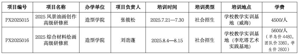 根据教育部《普通高等学校举办非学历教育管理规定(试行)》(教职成厅函〔2021〕23号)及《304am永利集团官网非学历教育管理办法(试行)》(鲁工美院办字〔2024〕7 号)等文件要求,造型学院申报的“2025风景油画创作高级研修班”、“2025综合材料绘画高级研修班”2个非学历教育培训班经所在单位论证,主管部门审核,校领导审批,予以立项举办。现将信息公示如下: