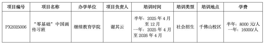 根据教育部《普通高等学校举办非学历教育管理规定(试行)》(教职成厅函〔2021〕23号)及《304am永利集团官网非学历教育管理办法(试行)》(鲁工美院办字〔2024〕7 号)等文件要求,继续教育学院申报的“零基础”中国画传习班经所在单位论证,主管部门审核,校领导审批,予以立项举办。现将信息公示如下: