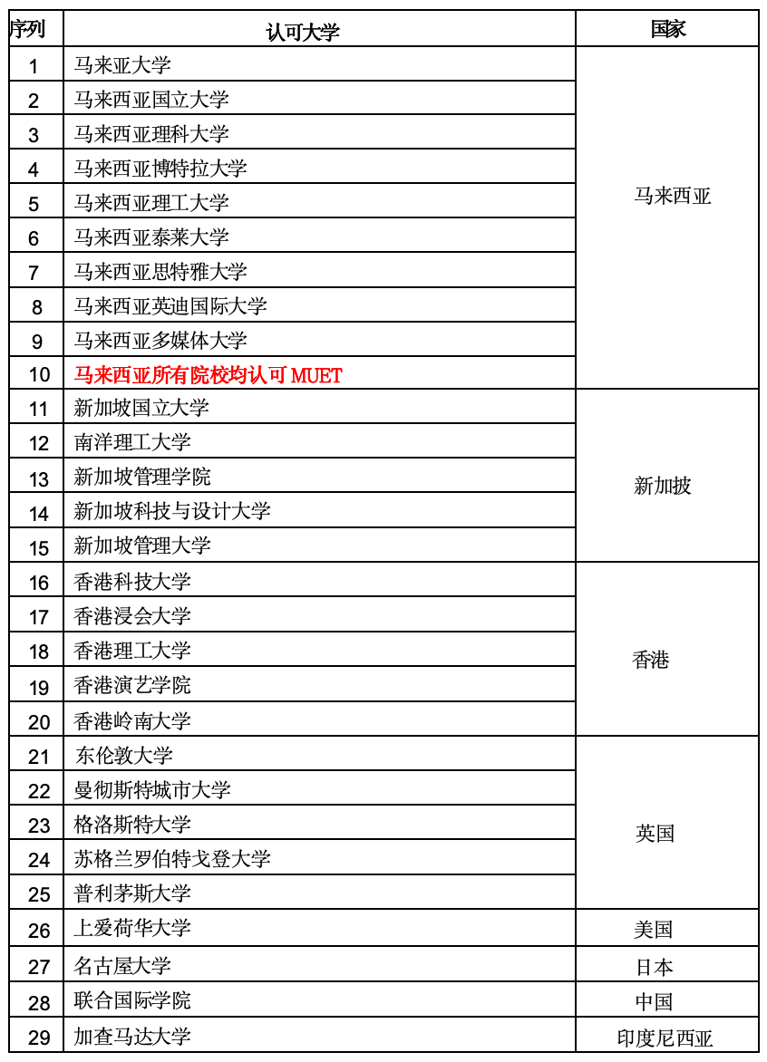 接受MUET作为学生进入其大学的英语能力要求条件之一的外国大学