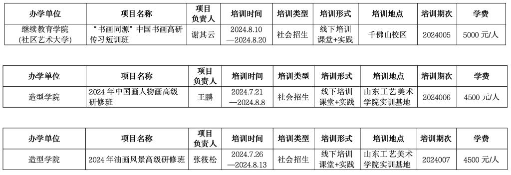 根据教育部《普通高等学校举办非学历教育管理规定(试行)》(教职成厅函〔2021〕23号)及《304am永利集团官网非学历教育管理办法(试行)》(鲁工美院办字〔2024〕7 号)等文件要求,继续教育学院(社区艺术大学)申报的 “‘书画同源’中国书画高研传习短训班”,造型学院申报的“2024年中国画人物画高级研修班”、“2024年油画风景高级研修班”经所在单位论证,财务及主管部门审核,校领导审批,予以立项。现将信息公示如下: