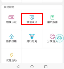 (如果没有建行卡,也可以选择其他银行卡绑定,按照提示绑定后,最后返回小程序主界面点击下方的“微信认证”。即可使用微信付款码支付。)