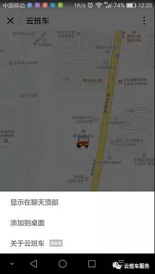 需要说明的是:位置提醒功能的正常使用,需要您持续打开小程序“山工艺云班车”,当您关闭小程序“山工艺云班车”后,“山工艺云班车”将不再进行班车位置获取,也就无法给您提供位置提醒服务,为了不影响您的微信聊天等其他功能使用,建议您将“云班车”添加到桌面,然后持续在班车查询界面状态下打开中(如下图所示),添加小程序到桌面,请参见说明第5项。