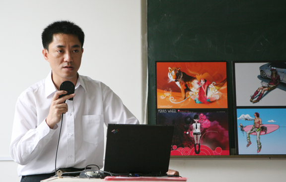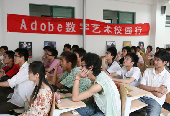 讲座中,王东老师首先给师生们描述了Adobe的产品分布与教育架构。接着又给大家讲解并演示了Photoshop CS3的图片拼接、自动调色等新增的强大功能。最后介绍了Adobe在全国范围内举办“中国风——Adobe 2007 Shall We Dance 数字艺术大赛”的相关事宜,鼓励在校大学生积极参加此次大赛。