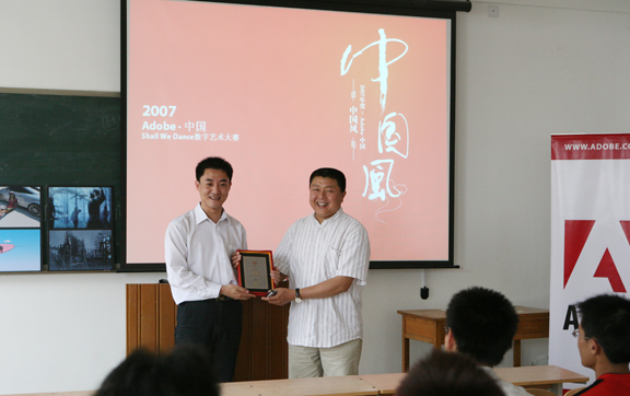 讲座开始,张伟院长首先对此次活动进行了致辞,指出在数字艺术领域中,Adobe的软件产品对于数字艺术的发展提供了强有力的支持,促进了设计行业、创意产业等相关领域的发展。同时指出,Adobe•中国主办的“中国风——2007年度Shall We Dance数字艺术大赛”为大家提供了一个很好的展示自己的平台,希望同学们积极参加此类大赛,在大赛中锻炼和提高自己。接着,Adobe•中国数字艺术大赛执行总监王东为张伟院长颁发了“2007年度Shall We Dance数字艺术大赛”评委证书。