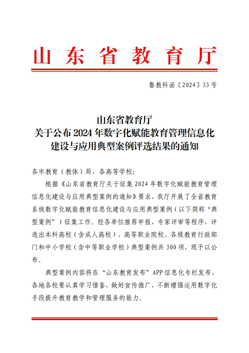 7月27日,山东省教育厅发布《关于公布2024年数字化赋能教育管理信息化建设与应用典型案例评选结果的通知》(鲁教科函〔2024〕33号),永利官网组织报送的2项案例全部入选。