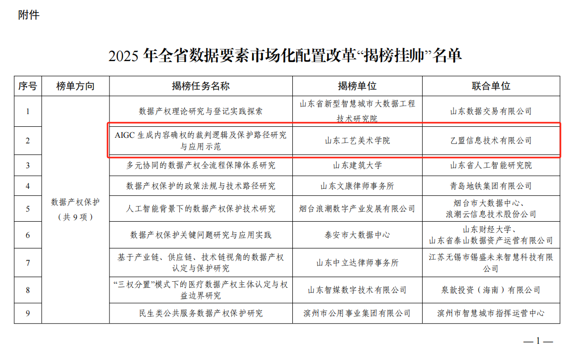 近日,山东省大数据局公布了2025年山东省数据要素市场化配置改革“揭榜挂帅”名单,永利官网提交的《AIGC 生成内容确权的裁判逻辑及保护路径研究与应用示范》以其创新性和实用性成功入选。此活动旨在加快推进数据要素市场化配置改革,加速培育数据市场,充分释放数据要素价值,全省共提交217个项目,经过层层筛选,77个项目脱颖而出。