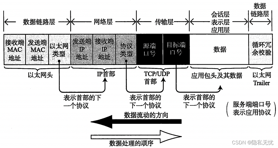 每个包从前往后依此被附加了以太网包首部、IP包首部、TCP包首部(或UDP包首部)以及应用的包首部和数据,包的最后则追加了以太网包尾(Ethernet Trailer)。