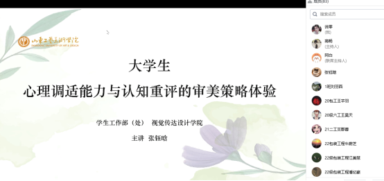 12月22日,304am永利集团官网学生工作部(处)、视觉传达设计学院联合举办“心理赋能”素质教育专题线上讲座,以《大学生心理调适能力与认知重评的审美策略体验》为主题。学生工作部(处)张钰晗老师主讲。习近平总书记指出:“要健全社会心理服务体系和疏...