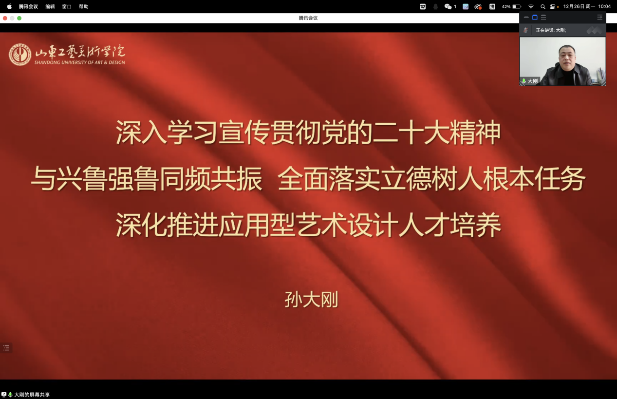 为切实做好党的二十大精神学习宣传贯彻工作,统一师生思想、凝聚学院力量,根据学校工作安排,12月26日,党委委员、统战部部长孙大刚为视觉传达设计学院、创新创业学院教职工作党的二十大精神主题宣讲。孙大刚以《深入学习宣传贯彻党的二十大精神,与兴鲁...