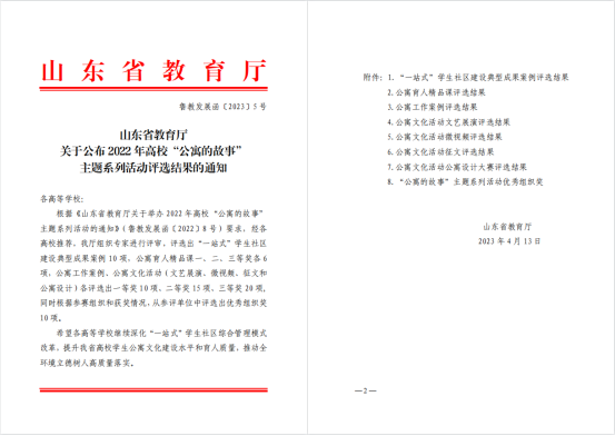 近日,山东省教育厅印发《关于公布2022年高校“公寓的故事”主题系列活动评选结果的通知》,304am永利集团官网在公寓文化活动文艺展演评选中喜获佳绩,最终获得一等奖一项、三等奖一项。全省高校“公寓故事”主题系列活动由山东省教育厅、山东省教育发展服...