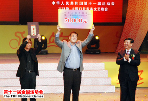 姜大明为吉祥物设计者颁奖 十一运会官方网站济南10月14日讯 14日晚上,中华人民共和国第十一届运动会吉祥物、主题口号发布仪式在济南隆重举行。