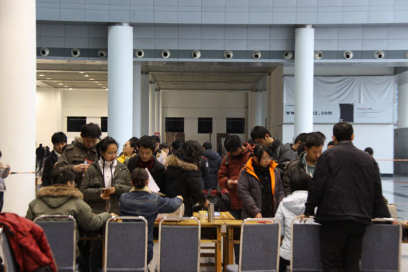 踏着黎明的曙光 迎接理想的朝阳 2月4日,永利官网2009年专业招生考试现场报名工作进入第二天,清晨6点,就有不少同学早早来到会展中心等待报名。