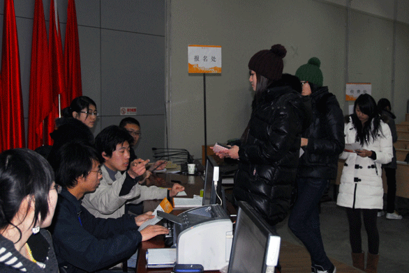 志愿者为考生热情服务 在招生考试报名现场,身带工作证的志愿者随处可见,领导、老师和学生志愿者放弃了寒假的休息时间,参与到学校一年一度的招生工作中。