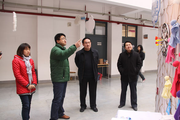 党委副书记杨新力参观视觉传达设计学院学生作业展 1月14日上午,党委副书记杨新力到教学楼参观了视觉传达设计学院2008包装设计班“28°”促销设计展。
